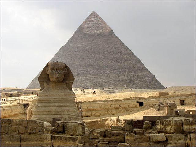 Great Pyramid. It has the head of a man, with the body and paws of a lion. It is cut out of solid rock. The face is mutilated, and the nose gone. It was worshiped as a god, and between its paws was an altar for offerings.